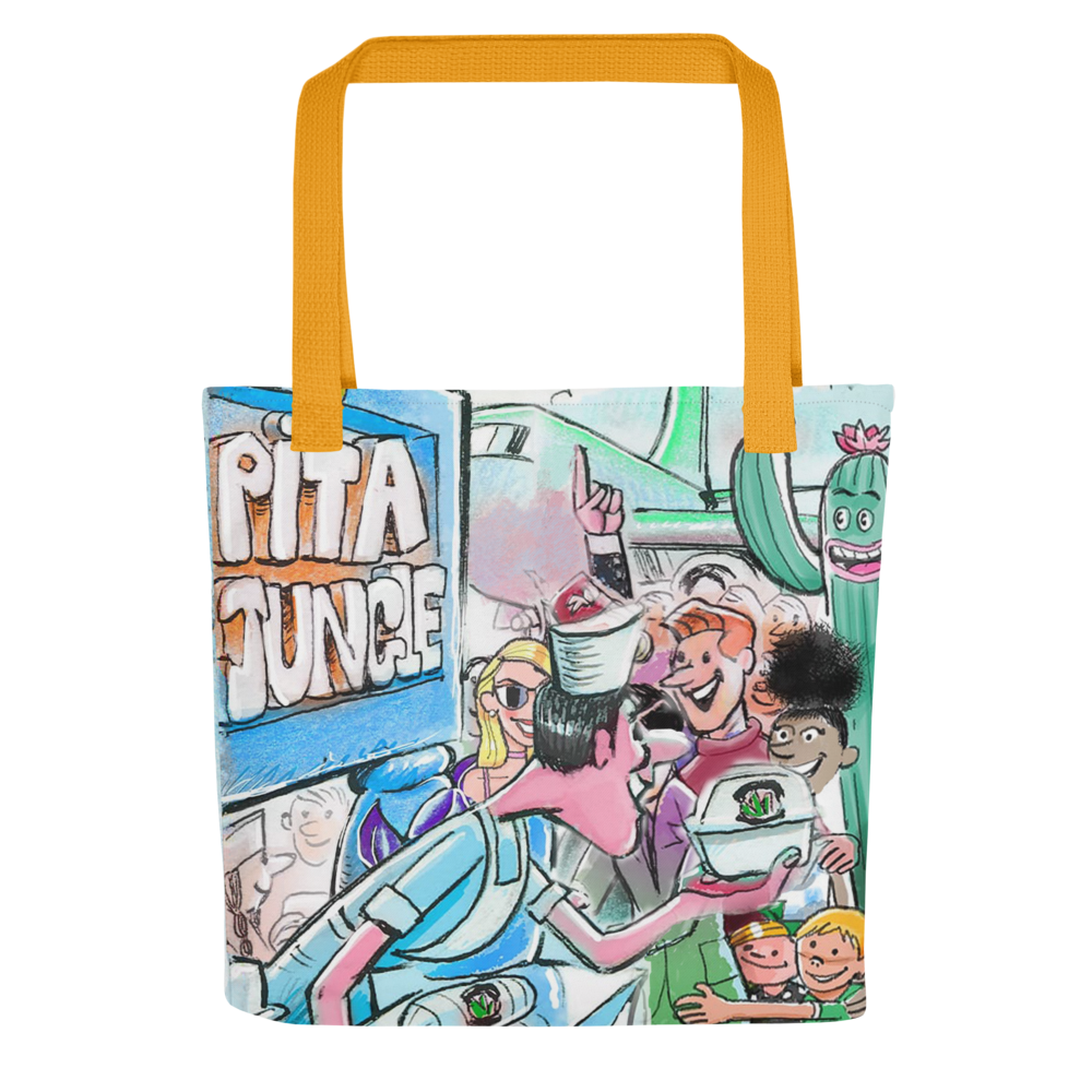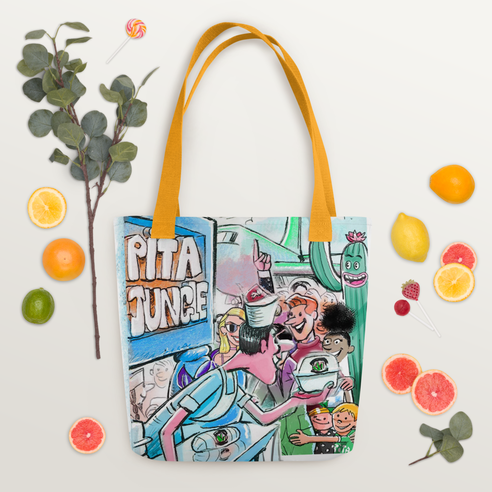 Bring the Pita Jungle vibe wherever you go with this durable everyday tote. The design features hand-drawn Mediterranean-inspired artwork in soft green tones that capture the freshness and creativity of our kitchens. Lightweight yet strong, this tote is perfect for groceries, books, or a day at the market.